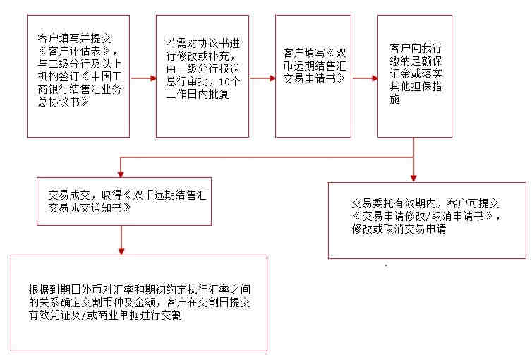 六、开通流程 客户首先应配合工商银行完成综合评估,填写并提交《客户评估表》,并与工商银行签订《中国工商银行结售汇总协议》用于明确双方权利义务关系。 叙做具体交易前,客户需要提交双币远期结售汇交易申请书,并对交易申请书所附的风险揭示内容及银保监会规定事项进行书面确认,确认已充分理解交易结构与潜在风险,愿意承担相应交易风险和潜在损失。交易达成前客户还需根据工商银行要求提供必要担保措施。交易达成后双方在产品存续期间及到期日按照协议履行相关交割或支付义务。